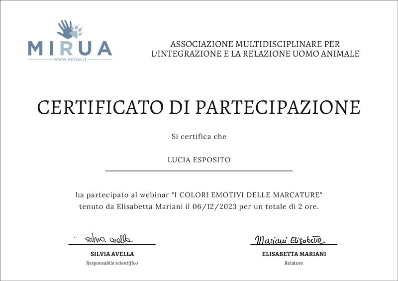 - Webinair “I colori emotivi delle marcature” con la dottoressa Elisabetta Mariani presso MIRUA - Associazione Multidisciplinare per l'Integrazione e la Relazione Uomo Animale